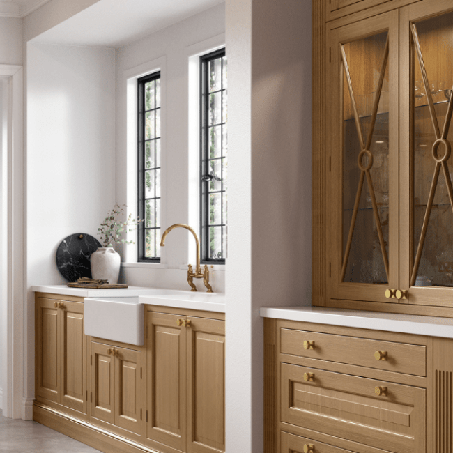Inspired by the traditional methods of fine cabinet making, the Burford kitchen offers elegance and charm with its meticulous detailing and stylish design, enhanced here by using a combination of Walnut and a bespoke painted Suede finish.